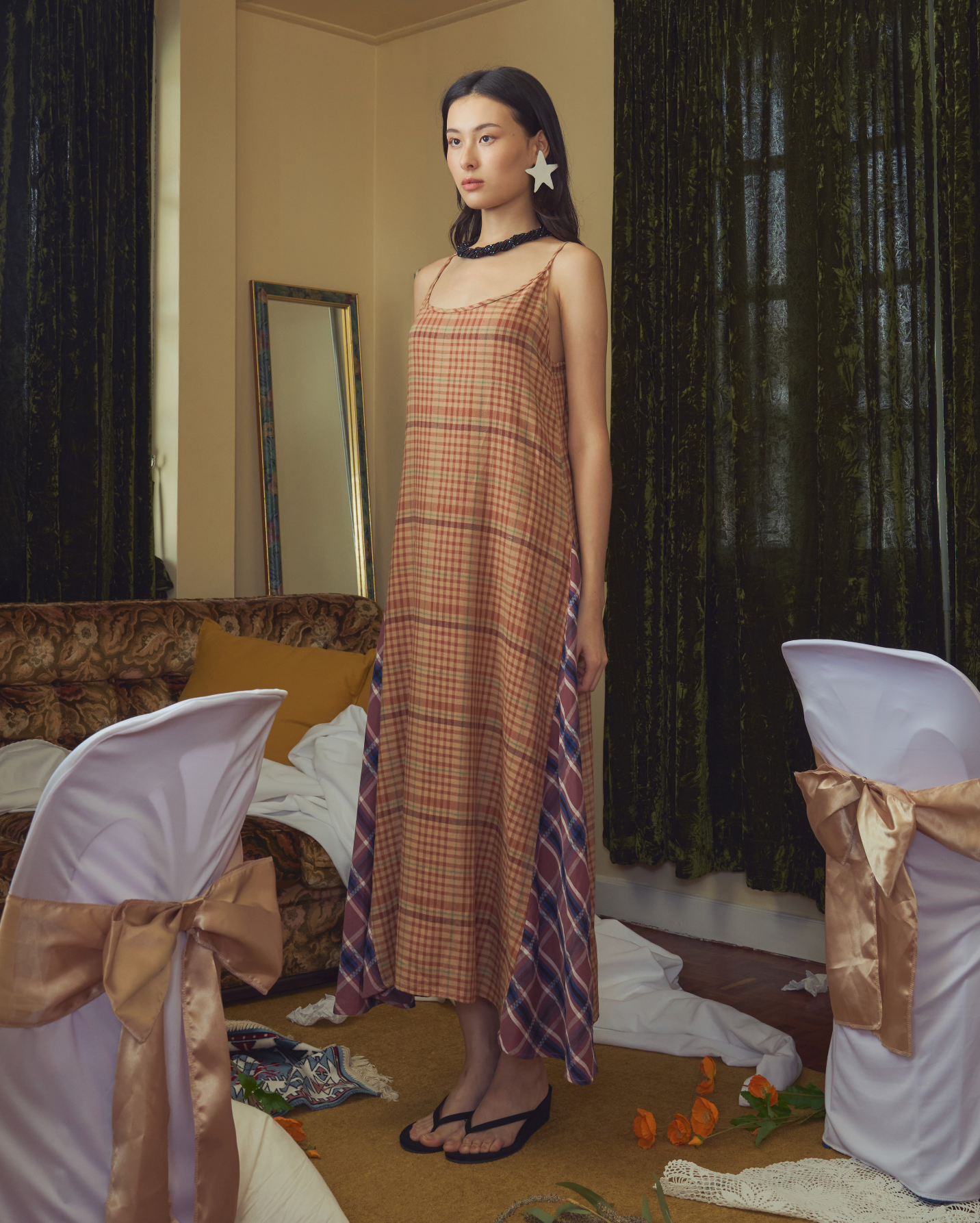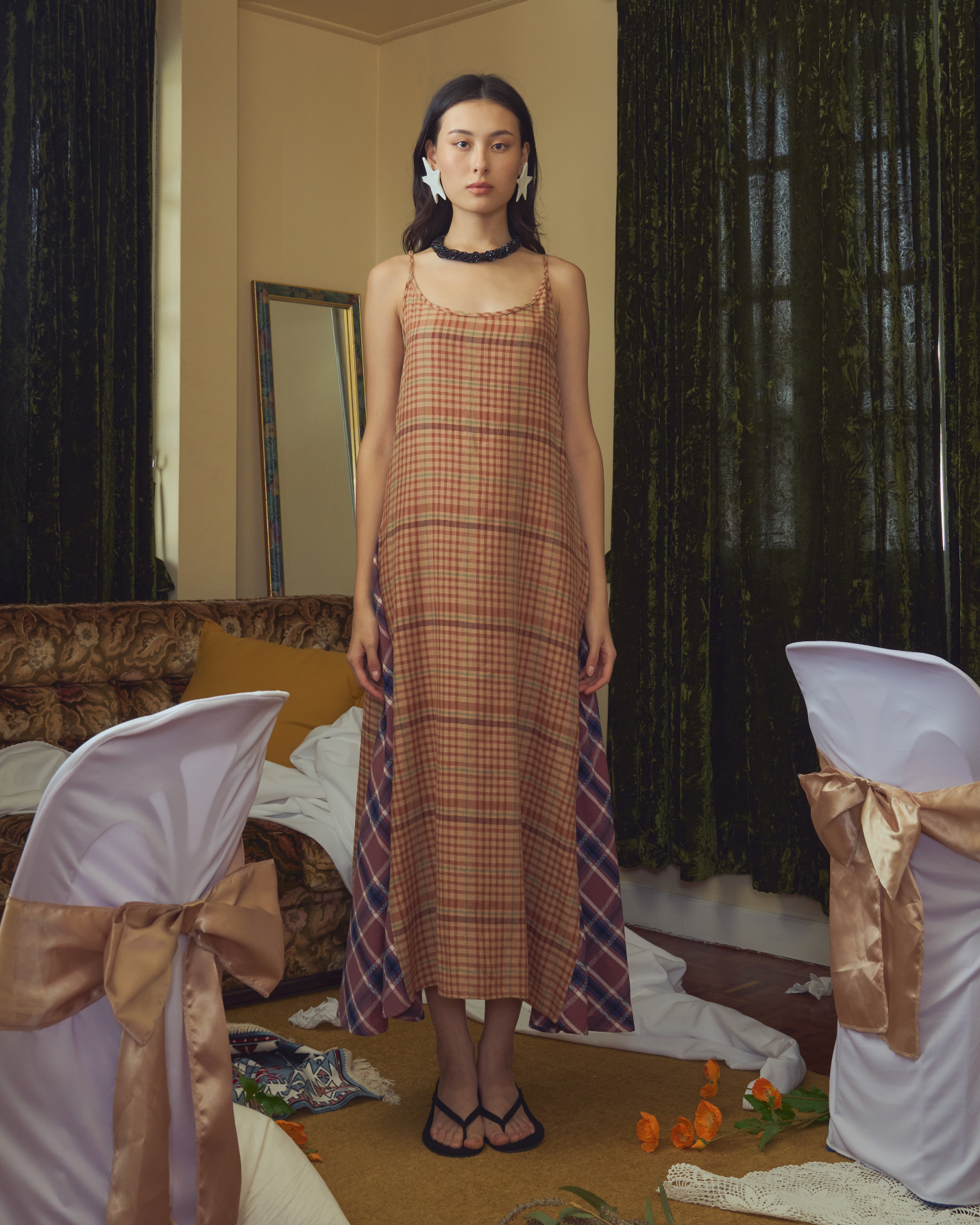 Made from Jamdani fabric - 100% fine cotton cloth, hand-loomed and handwoven in India. High neckline with open back details. Designed for a semi-fitted flared midi length dress. Model is 175cm tall and is wearing a size S. *Please note accessories and undergarment (Jani Dress) used in this image are for styling purposes.